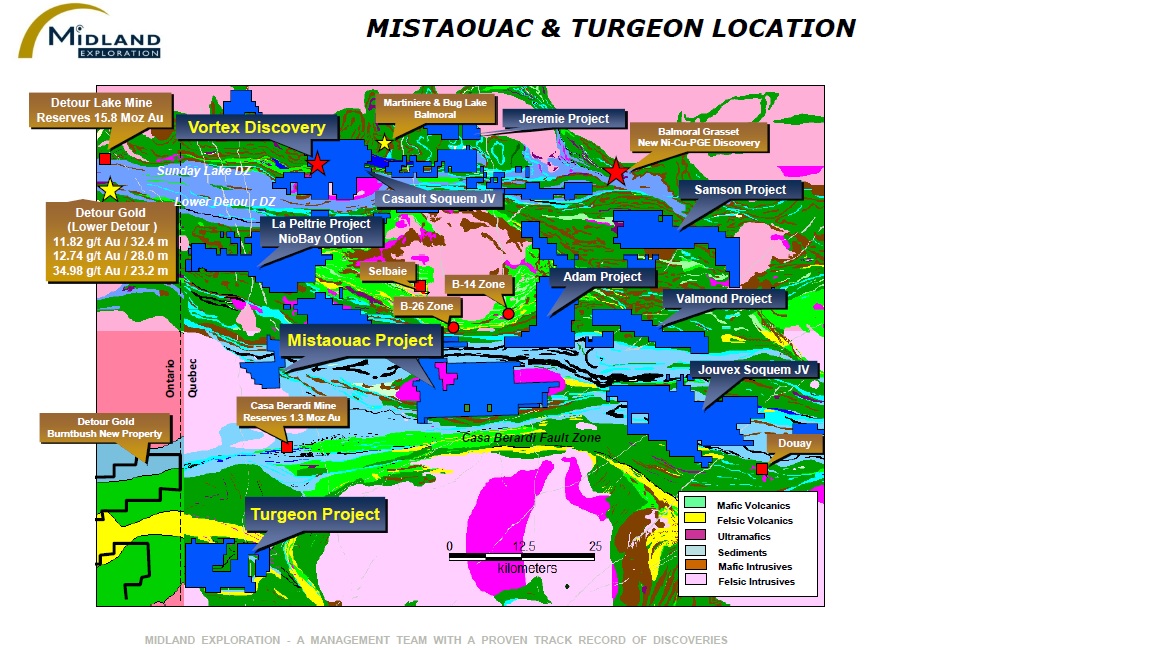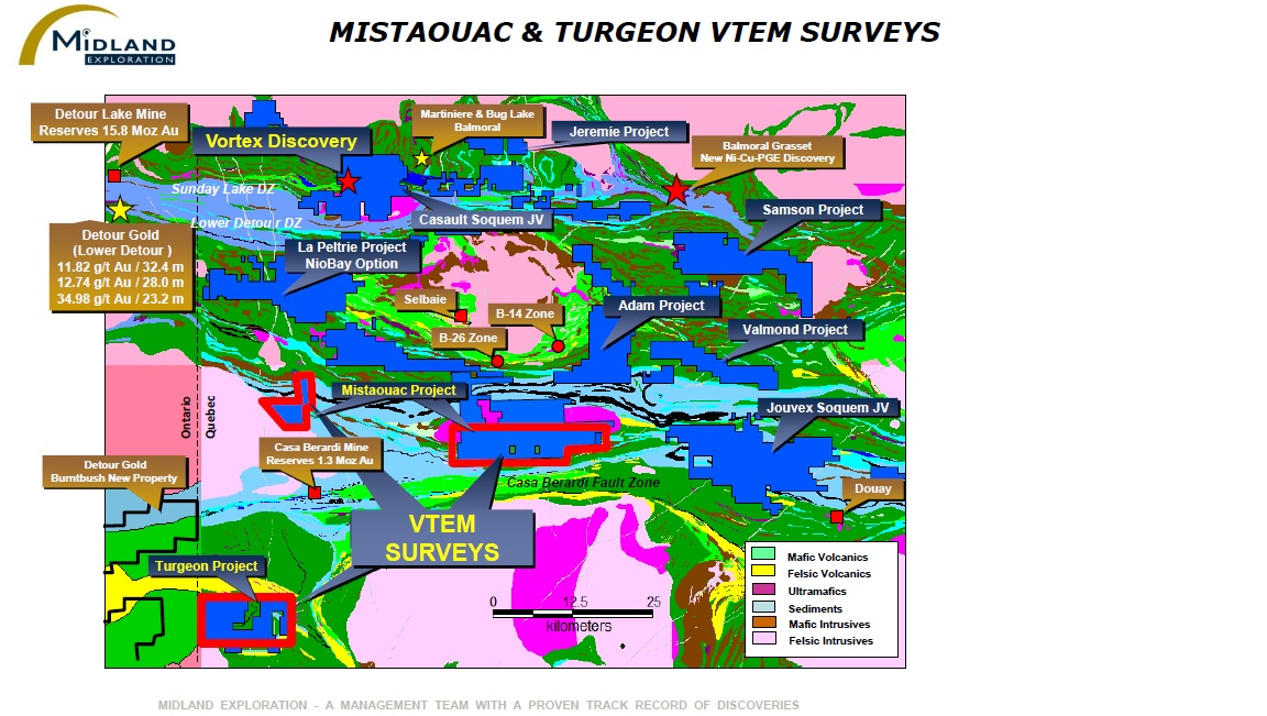 Midland débute un important levé VTEM sur Mistaouac et Turgeon à proximité de Casa Bérardi et reprend le forage sur Vortex.