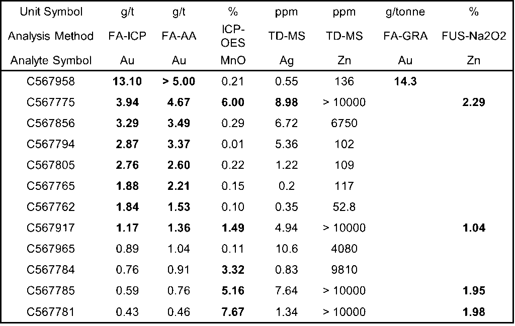 Rock samples from the project were analyzed at Actlabs laboratories in Ancaster, Ontario, by ICP-MS with 4-acid digestion for metals, and by standard fire assay on 30-gram fractions with atomic absorption finish for gold and by ICP-OES fusion for major elements (including MnO). Soil samples are processed and analyzed at Actlabs laboratories in Ancaster, Ontario, by neutron activation (namely for Au) and ICP-OES with 4-acid extraction (namely for Zn and Mn), after sieving to -177 microns. Exploration programs are designed, and results are interpreted by Qualified Persons employing a Quality Assurance/Quality Control program consistent with industry best practices, including the alternate use of standards and blanks for every 20 samples.