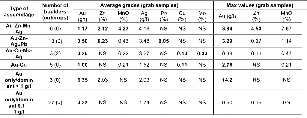 - Several important clusters of Au-Zn-Mn-Ag and Au-Zn-Ag-(Pb)-bearing boulders coinciding with extensive Au-Zn anomalies in soils;