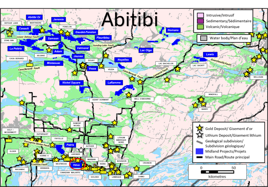 Le bloc Heva Ouest est contigu à l’ouest de la propriété Maritime-Cadillac et est situé à moins d’un kilomètre au sud de la mine d’or Lapa d’Agnico Eagle.